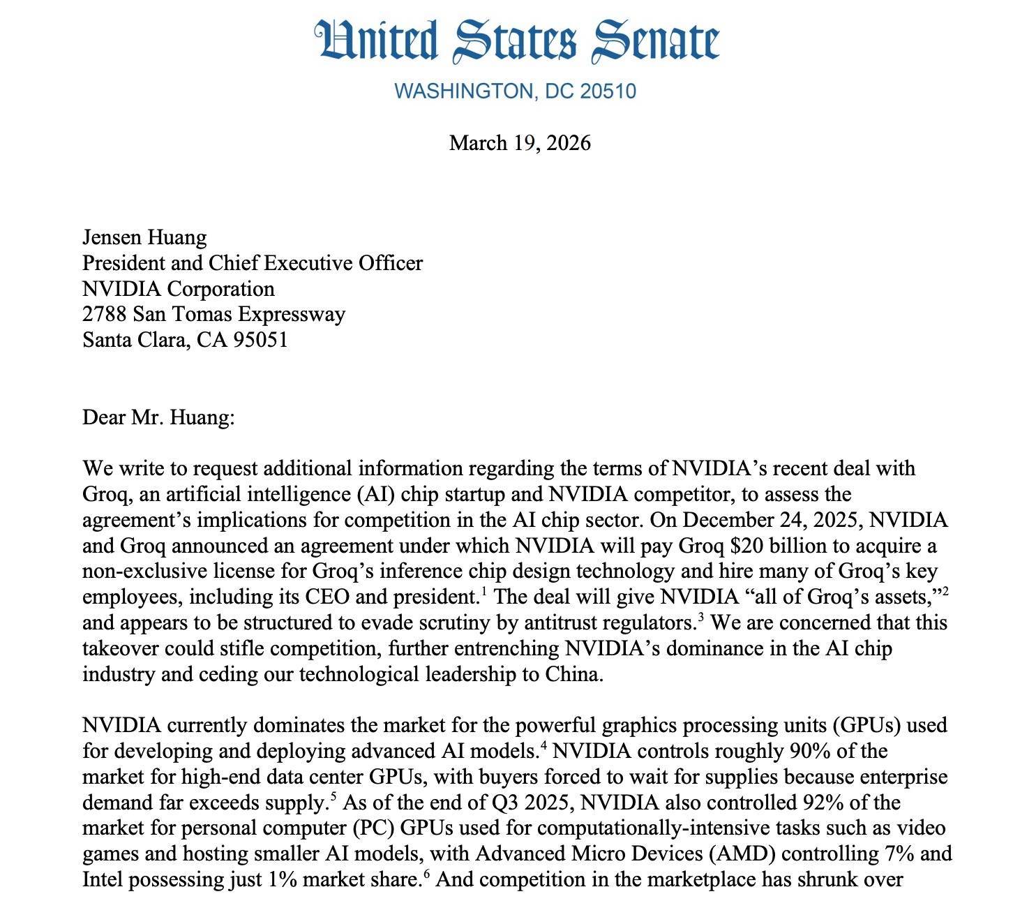 他们还要求英伟达披露与Groq交易的具体条款,以及该交易是否被刻意设计以规避反垄断审查。